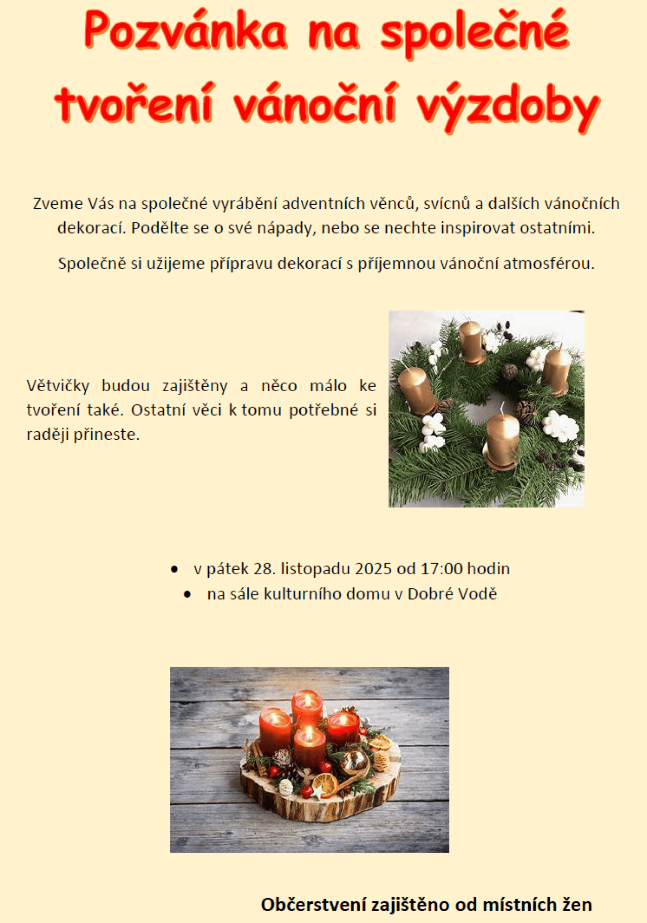 Pozvánka na společné tvoření vánoční výzdoby - 28.11.2025 v Dobré Vodě