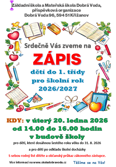 ZŠ a MŠ Dobrá Voda - Zápis dětí do 1. třídy - 20.1.2026