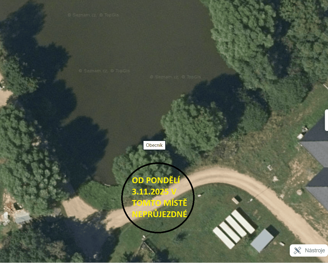 Od pondělí 3.11.2025 začnou zemní práce na čerpací stanici u rybníku Obecník. Z tohoto důvodu bude po dobu prací místní komunikace v tomto místě neprůjezdná (viz mapka níže)